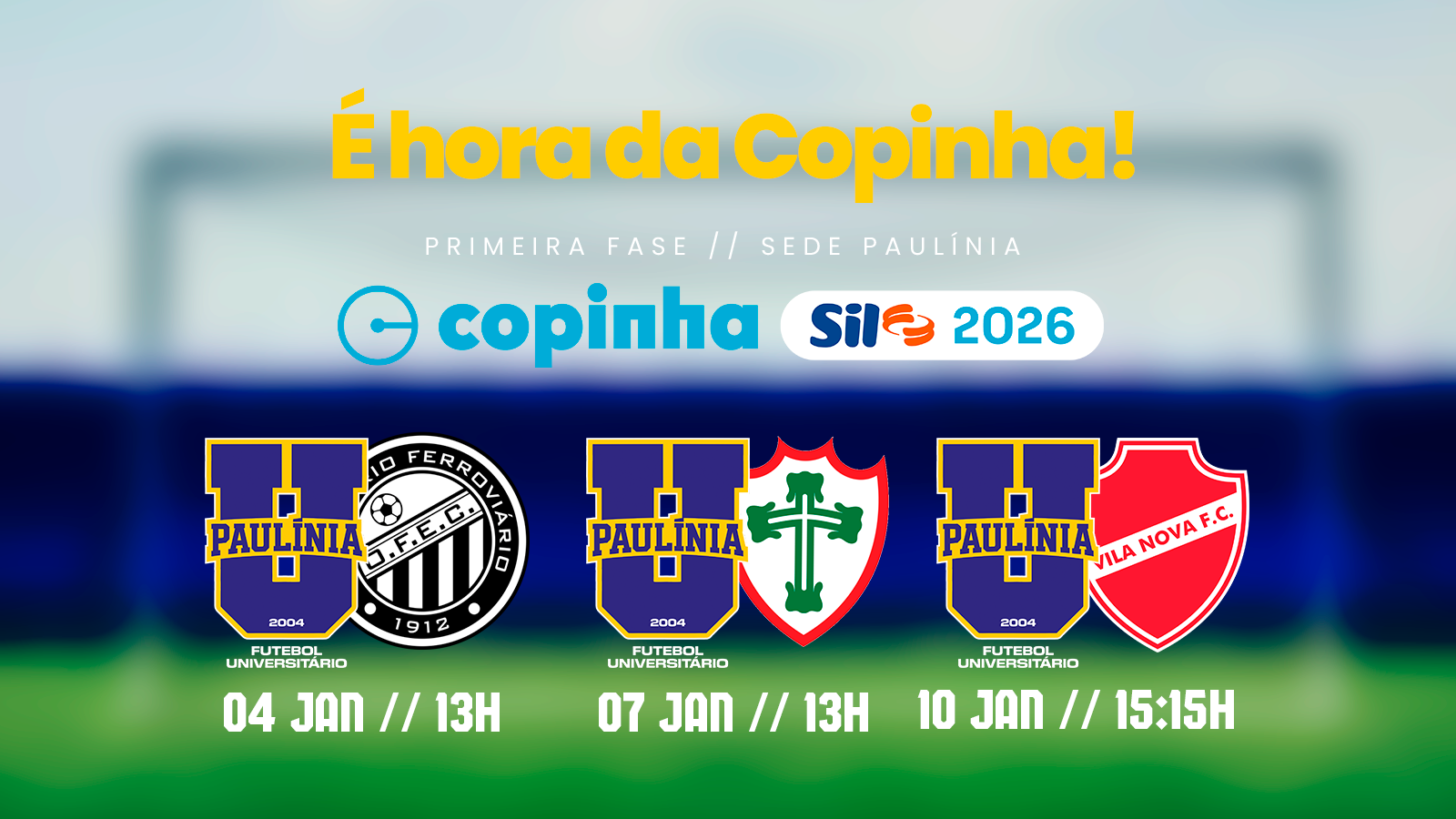 O Paulínia Futebol Universitário já tem seus jogos confirmados na @copinha 2026 e você não pode ficar de fora 💛💙ANOTA AÍ:04/01 às 13h (ESTREIA)07/01 às 13h10/01 às